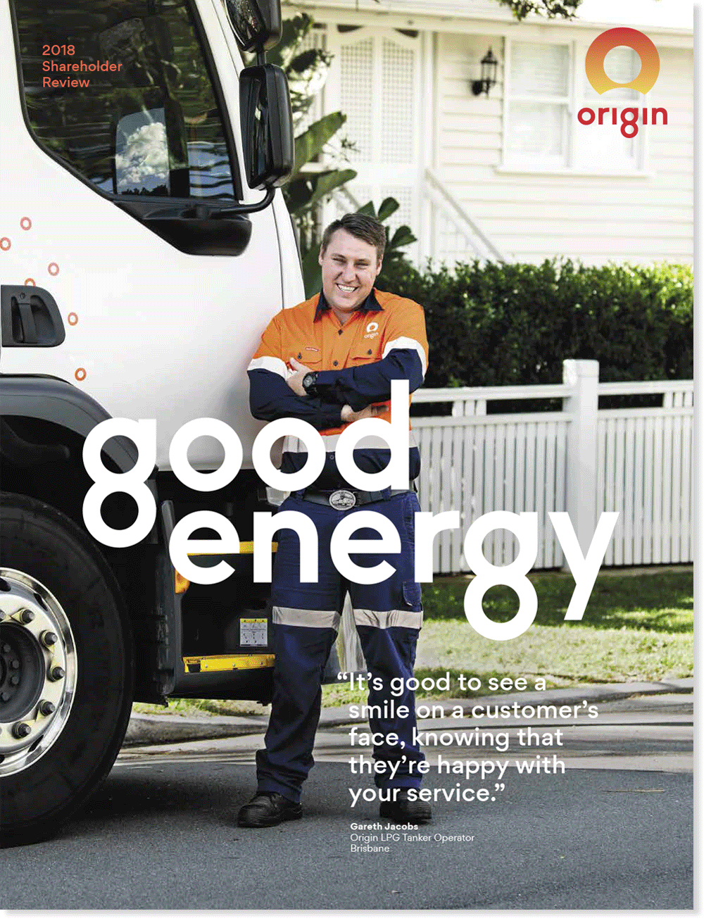 Design of the Reporting Suite for Origin where ‘good energy’ is much more than a tag line but embodies everything that Origin works towards. Expanding upon the new brand guidelines to create a striking and distinguishable suite of reporting collateral, with an uplifting and positive view of cleaner energy.